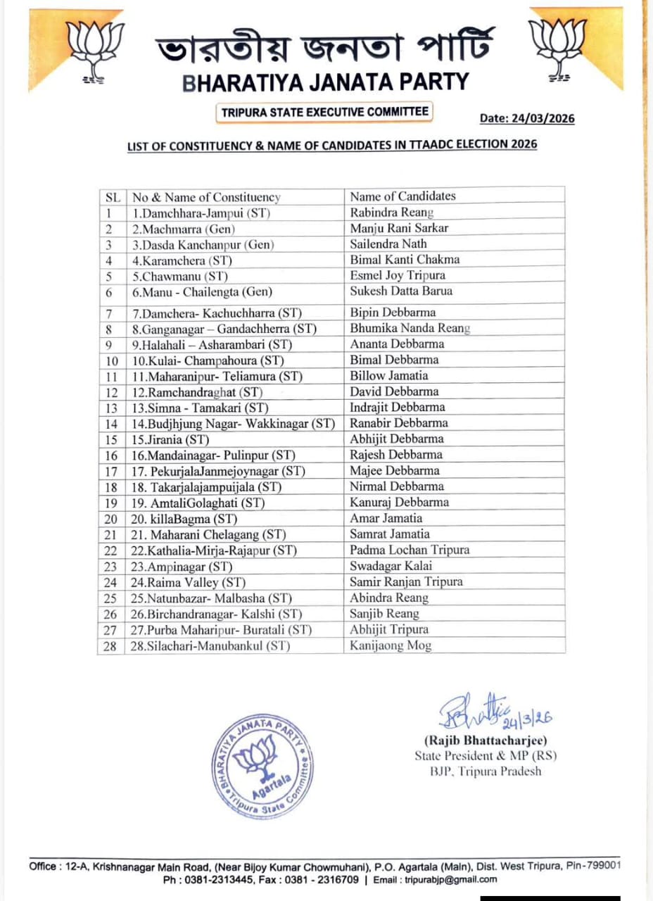 Agartala, Mar 24: The ruling Bharatiya Janata Party (BJP) on Tuesday announced its full list of candidates for the upcoming Tripura Tribal Areas Autonomous District Council (TTAADC) elections, confirming that it will contest all 28 seats independently. The announcement was made during a press conference at the party’s state headquarters.