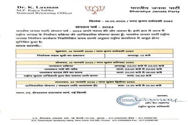 According to the notification, the electoral roll for the election was published on January 16. The process of filing nominations will take place on January 19. On the same day, scrutiny of nominations will be conducted, followed by the withdrawal of nominations, if any. In the event that voting becomes necessary, it will be held on January 20 between 11:30 AM and 1:30 PM. The official declaration of results will follow immediately thereafter. All stages of the election process will be conducted at the BJP headquarters located at 6-A, Deendayal Upadhyay Marg, New Delhi.