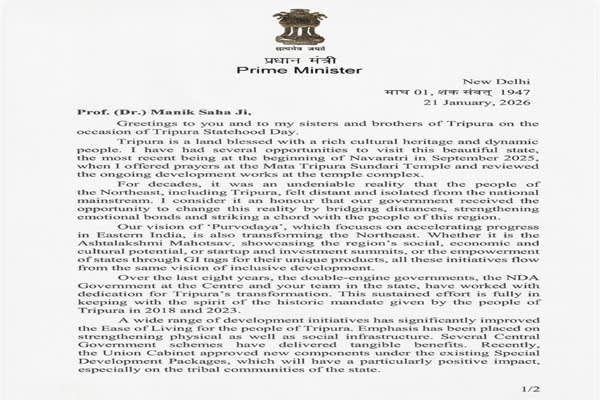 Chief Minister Dr. Manik Saha, in a social media post, expressed gratitude to the Prime Minister and reaffirmed Tripura’s commitment to unity, heritage, and prosperity. In a video message, he extended greetings to citizens and recalled January 21, 1972, when Tripura, along with Manipur and Meghalaya, attained full statehood.