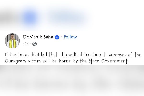 The Tripura government will bear the entire medical expenses of the 19-year-old woman from the state who was allegedly confined and assaulted in Gurugram, Chief Minister Manik Saha said.